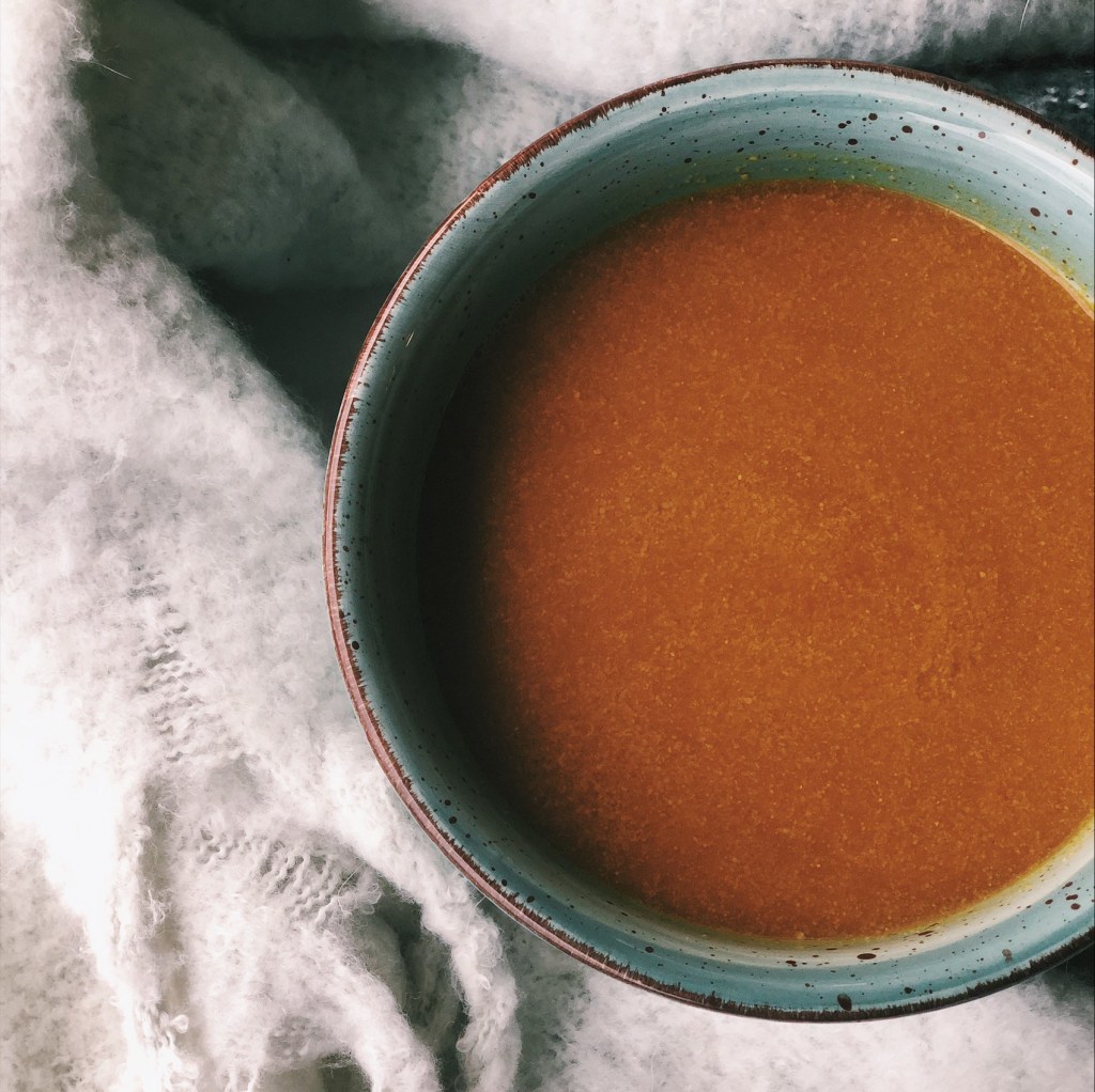 When I had a cold a little while back I just wanted some nice warm soup. But I didn’t want processed, canned soup (or to go to the store!). I wanted a soup full of turmeric to help with inflammation and I wanted it a little spicy because I like a little spice in everything – helps clear the sinuses! So this yummy, spicy, warm soup base was born and it’s uses grew from there.